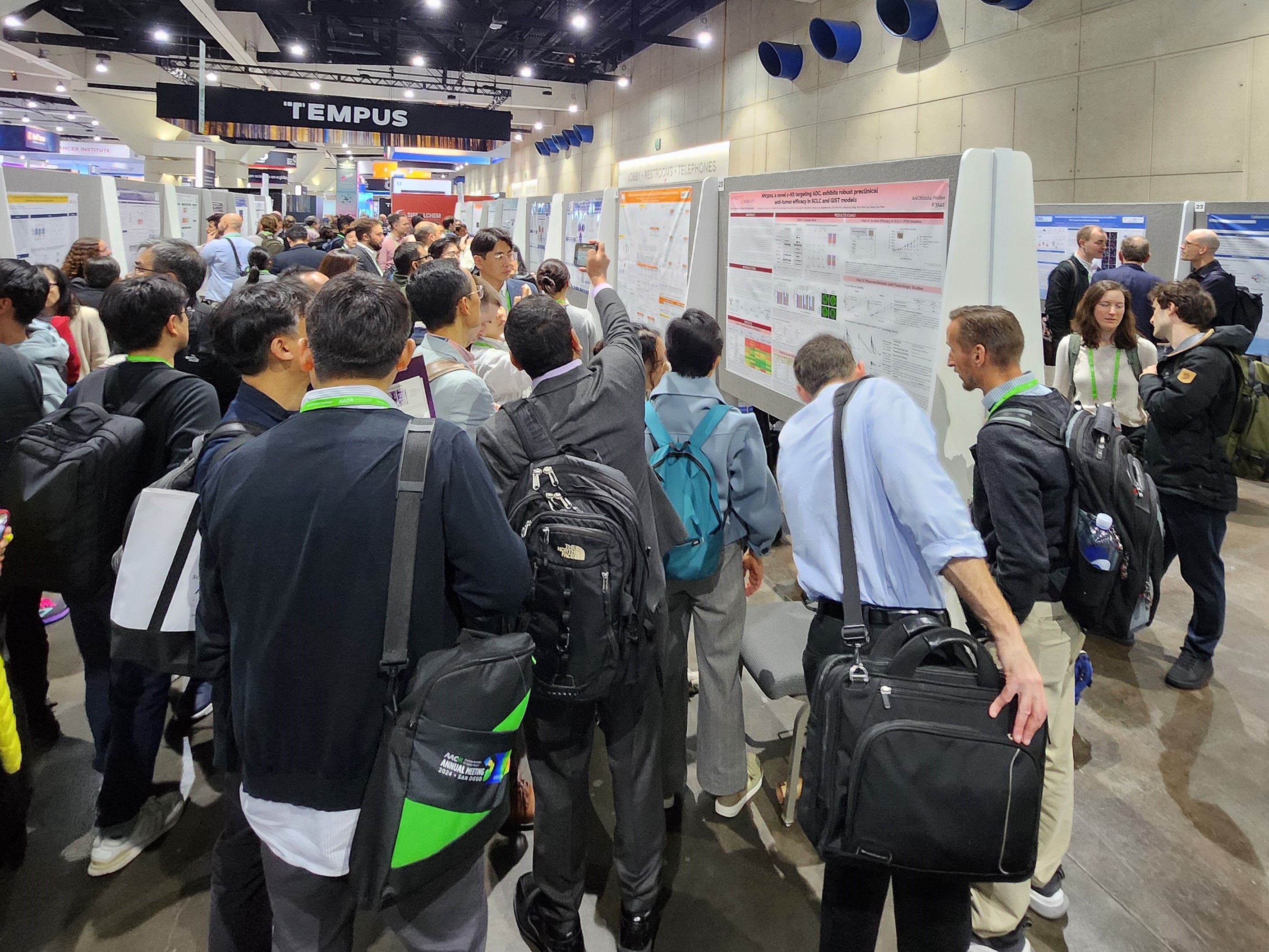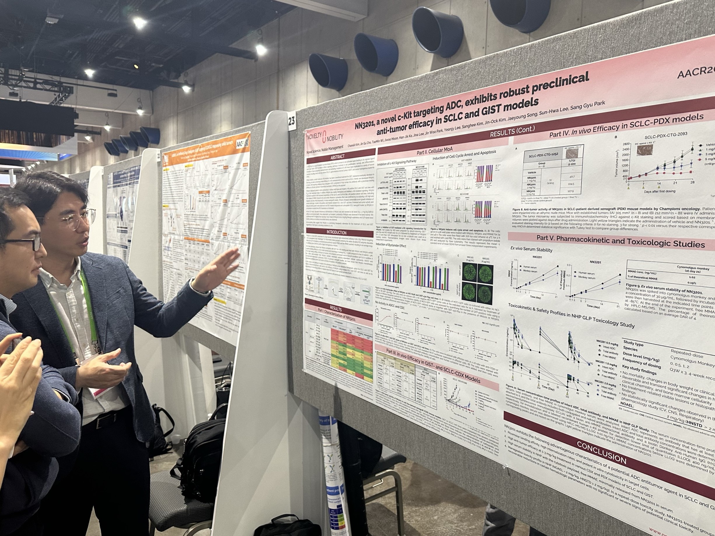 2024 AACR 프로그램 중 글로벌 빅파마를 포함한 모든 참가자들의 주요 관심사는 ADC 기반 신약 후보들이었다. 노벨티노빌리티는 2023 AACR 포스터 발표 이후 연구개발 분야의 모든 구성원들의 노력과 열정으로 in vitro cellular efficacy, in vivo efficacy, NHP 독성결과를 update하여 2년 연속 NN3201 포스터 (#3142, NN3201, a novel c-Kit targeting ADC, exhibits robust preclinical anti-tumor efficacy in SCLC and GIST models)를 발표했다. 이번 2024 AACR 행사 이전부터 글로벌 항암제 시장의 트렌드로 부상한 ADC는 발 디딜 틈 없을 정도로 다른 어떤 세션보다 많은 관심을 받았다. 물론 노벨티노빌리티의 NN3201, ADC, c-Kit, SCLC, GIST라는 핵심단어는 많은 참가자들의 발길을 끌어당기기에 충분했다. 4월 10일 오후 1시 반부터 5시까지 거의 4시간 동안 선 채로 방문자들의 다양한 질문에 대응한 Arlo, Andrea, 송재영 본부장, 그리고 고한직 팀장님께 감사드린다. (특히 사진 촬영을 도와준 고한직 팀장님께 더 ㅎㅎ)